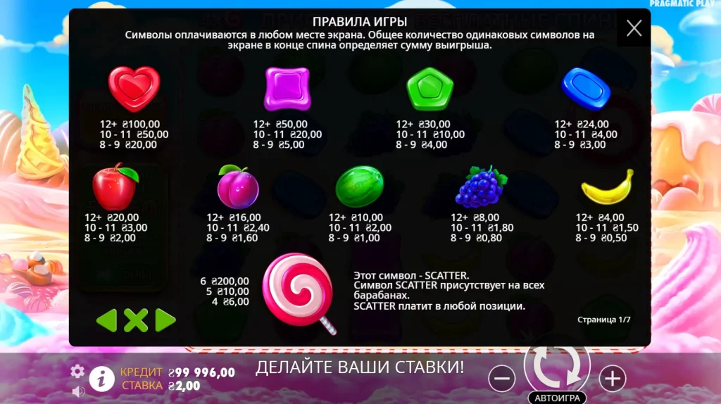 Під час вільних обертів на екрані будуть з’являтись різнокольорові цукрові бомби. Вони дозволяють виграти значно більше, бо дарують випадковий множник. Його значення рандомне — від х2 до х100. Максимальний виграш, який можливий у цьому раунді — х21 000.